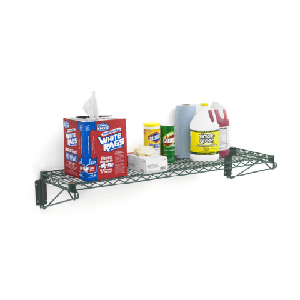 OlympicJ1448WSK-SR POS Olympic™ Wall Mount Kit - 48"W X 14"D 250 Lb. Capacity Per System is a specialized storage solution designed for robust performance and optimal space utilization. This wall mount kit includes a single 48"W x 14"D wire shelf, augmented by two 14-inch wall mount supports and accompanying mounting plates to ensure secure installation. With a load capacity of 250 pounds per system, it provides a sturdy platform for storing a variety of items, catering to industries ranging from retail to hospitality. The system's design is heightened by the inclusion of four chrome-plated hole plugs, enhancing its aesthetic appeal while maintaining durability. A green epoxy finish not only offers a sleek, modern look but also ensures resilience against wear and tear, making it ideal for environments requiring cleanliness and longevity. Additionally, this product is NSF certified, assuring compliance with health and safety standards, a critical consideration for businesses within the food service industry. The OlympicJ1448WSK-SR kit stands as a versatile and reliable addition to any workspace, merging functionality with enduring design to meet diverse market needs effectively.