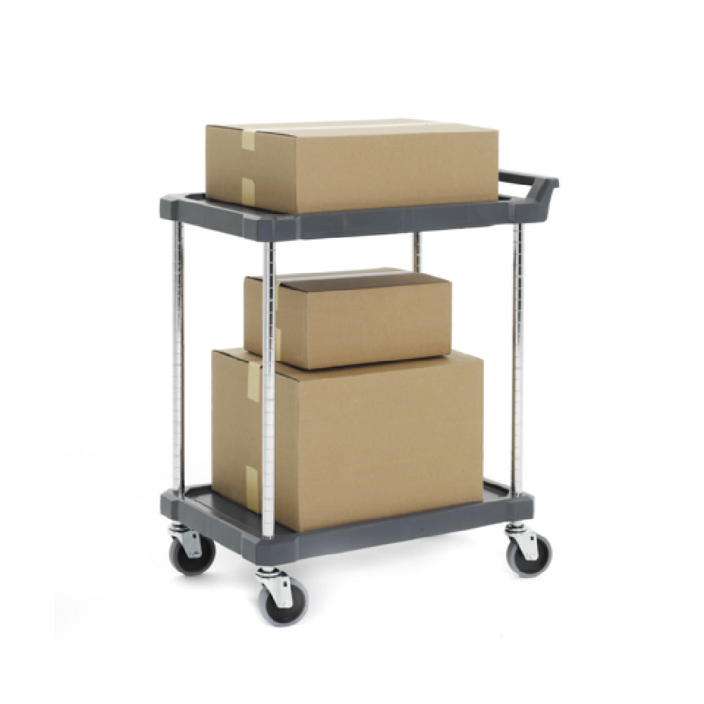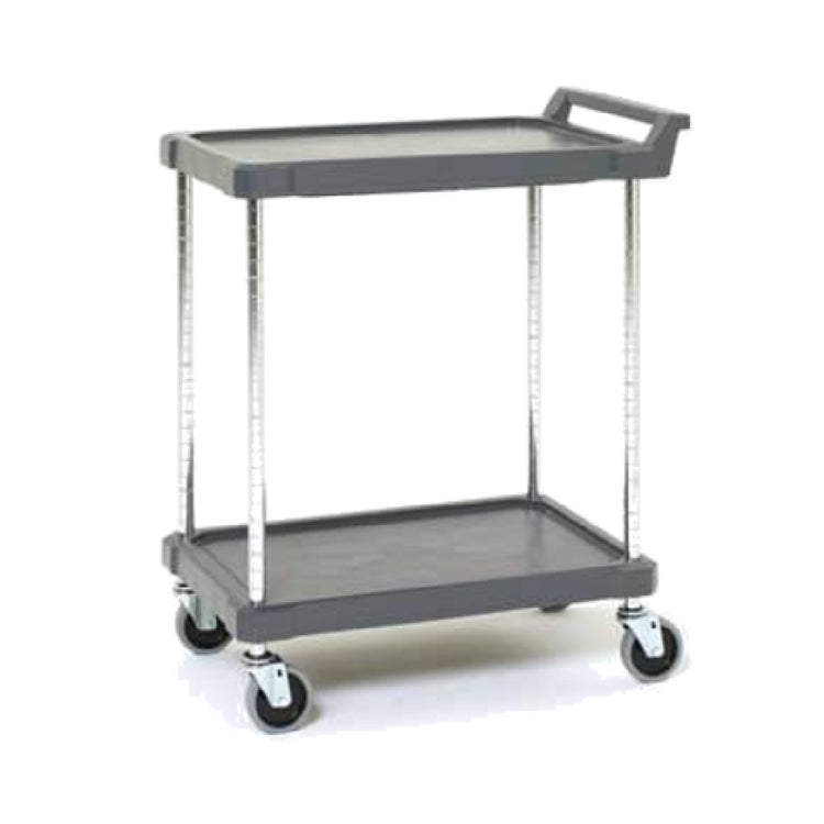 OlympicJ16UC2 Utility Cart 2-shelf 16" X 27" is a versatile and durable solution for various industrial applications, providing ample utility and efficiency with its thoughtfully engineered design. This utility cart boasts two ship's edge polyethylene shelves, each measuring 16 inches by 27 inches, ensuring a reliable and sturdy platform for transporting goods in diverse environments. With chrome-plated posts enhancing its structural integrity, the OlympicJ16UC2 supports a substantial 150 lb. shelf capacity, while the overall cart can handle up to 400 lb., making it suitable for heavier loads. It navigates smoothly across surfaces, thanks to its four 4-inch swivel stem casters, enabling easy maneuverability. The cart's charcoal gray finish not only adds a sleek aesthetic but also helps in maintaining a clean appearance. Shipped KD (knocked down) for efficient transportation and storage, it aligns with stringent public health standards as evidenced by its NSF certification. The OlympicJ16UC2 Utility Cart is ideal for various markets including healthcare, hospitality, and warehousing, where transport and organization of materials are crucial, providing a robust and reliable solution tailored for efficiency and durability in demanding environments.