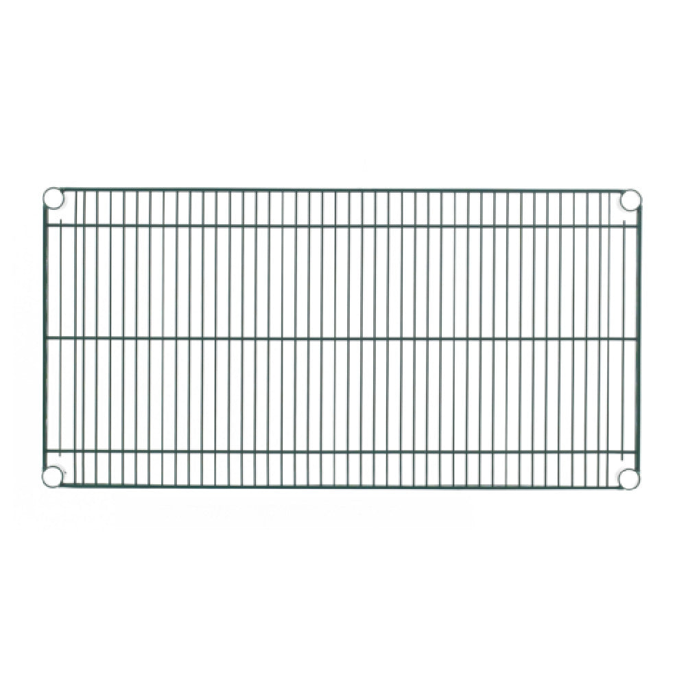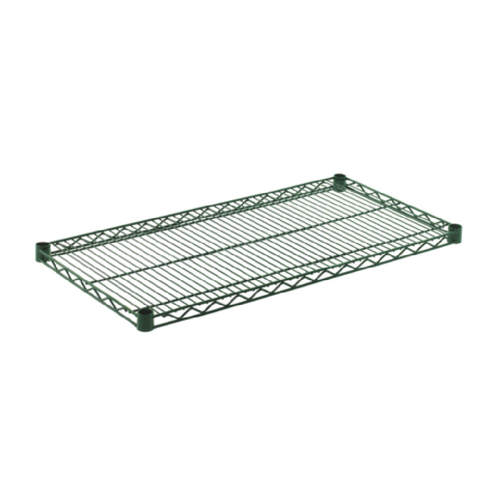 The Olympic J1836K Shelf Wire 18" X 36" is a meticulously designed storage solution, engineered to meet the standards of diverse industrial and commercial environments. This shelf features a robust green epoxy finish, providing a durable and protective coating that enhances its longevity and resistance to wear. The chromate substrate underneath the epoxy finish is a testament to its structural integrity, offering additional strength and support for heavy-duty storage needs. Measuring precisely 18 inches by 36 inches, this shelf is sized to accommodate a variety of storage requirements, making it versatile for use in different sectors such as food service, retail, and warehousing. As an NSF certified product, it guarantees adherence to strict public health and safety standards, making it an ideal choice for industries where hygiene and durability are paramount. The wire construction not only ensures optimal airflow, preventing dust accumulation and enhancing visibility but also supports easy cleaning and maintenance. The Olympic J1836K Shelf Wire 18" X 36" is an exemplification of quality and practicality, making it a valuable addition to any professional setting requiring reliable shelving solutions.