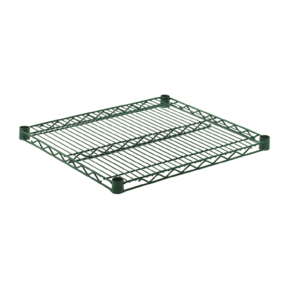 The OlympicJ2124K Shelf Wire 21"-24" is a versatile shelving solution designed to meet the diverse needs of various industries, ranging from retail to food service. With dimensions of 21 inches by 24 inches, this shelf is crafted from high-quality wire, ensuring both durability and a lightweight design. Its green epoxy finish not only provides an aesthetically pleasing appearance but also offers enhanced protection against corrosion, extending the product's lifespan especially in humid environments. The chromate substrate layer further reinforces this shelf's resistance to wear and tear, making it a cost-effective choice for businesses seeking longevity in their storage solutions. Being NSF-certified, the OlympicJ2124K ensures compliance with stringent health and safety guidelines, making it a reliable choice for food storage and preparation areas. This certification underscores its suitability for professional kitchens, supermarkets, and other sanitary-conscious environments. The shelf's design facilitates easy air circulation, which is crucial for maintaining the quality of perishable goods. Whether used in a commercial kitchen, warehouse, or retail space, the OlympicJ2124K Shelf Wire provides a sturdy and efficient storage solution, highlighted by its blend of functionality, durability, and compliance with industry standards.
