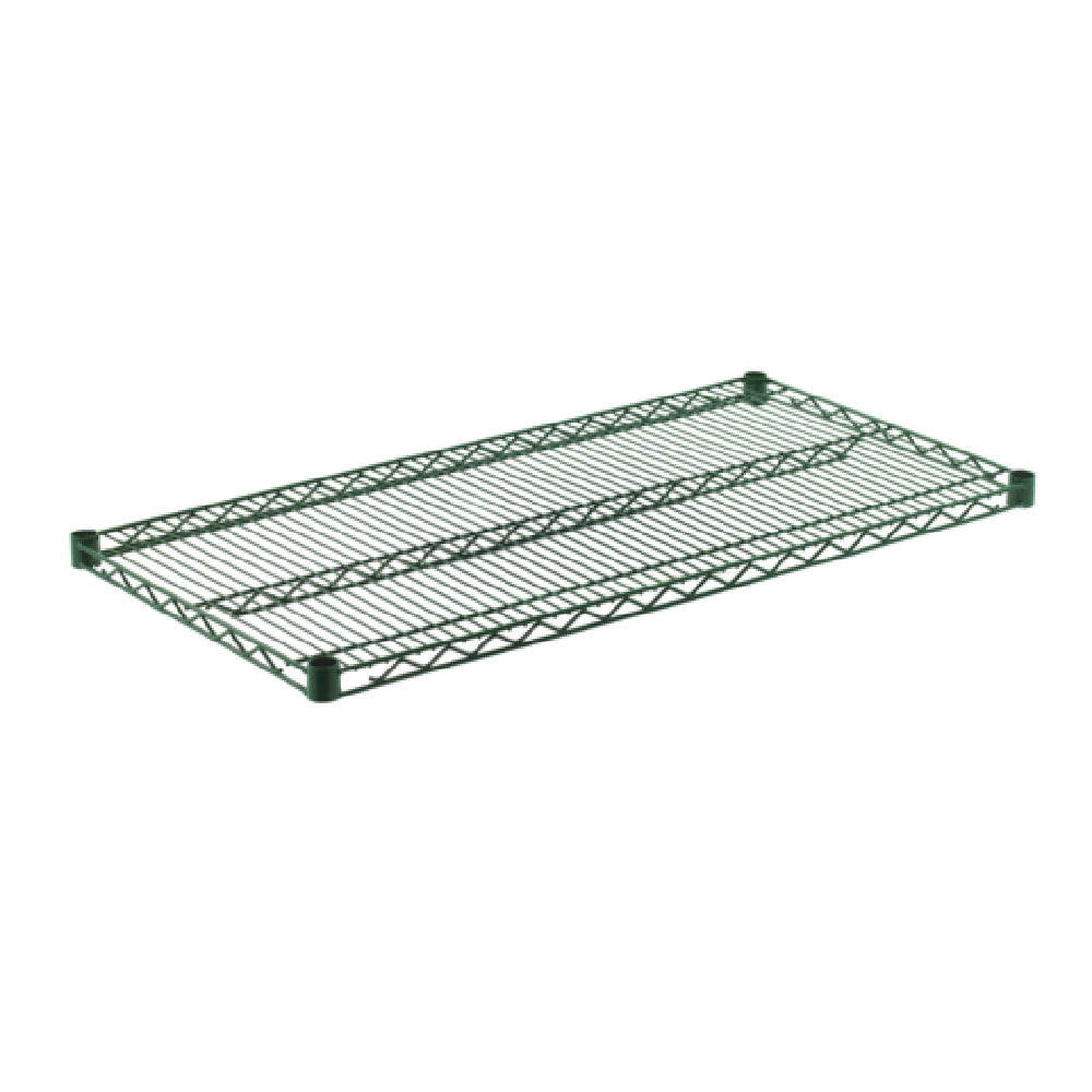 The OlympicJ2142K Shelf Wire 21" X 42" is a durable storage solution designed to meet the rigorous demands of commercial environments. This shelf features a robust green epoxy finish, significantly enhancing its resilience against corrosion and environmental wear, making it suitable for use in humid or wet areas. The underlying chromate substrate adds an additional layer of durability, ensuring a long-lasting performance. Measuring 21 inches by 42 inches, this wire shelf accommodates a significant amount of inventory, making it ideal for a variety of storage needs within both the retail and food service industries. The OlympicJ2142K is NSF certified, verifying its compliance with strict public health and safety standards, which is crucial for industries that prioritize hygiene and cleanliness. The design of this shelf allows for excellent air circulation, which is beneficial for storing perishable goods or items that require ventilation. This shelf is especially useful in restaurant kitchens, food storage facilities, and any setting where organized and efficient storage is critical. Its combination of size, durability, and safety certification makes the OlympicJ2142K Shelf Wire 21" X 42" a valuable addition to any professional storage system.
