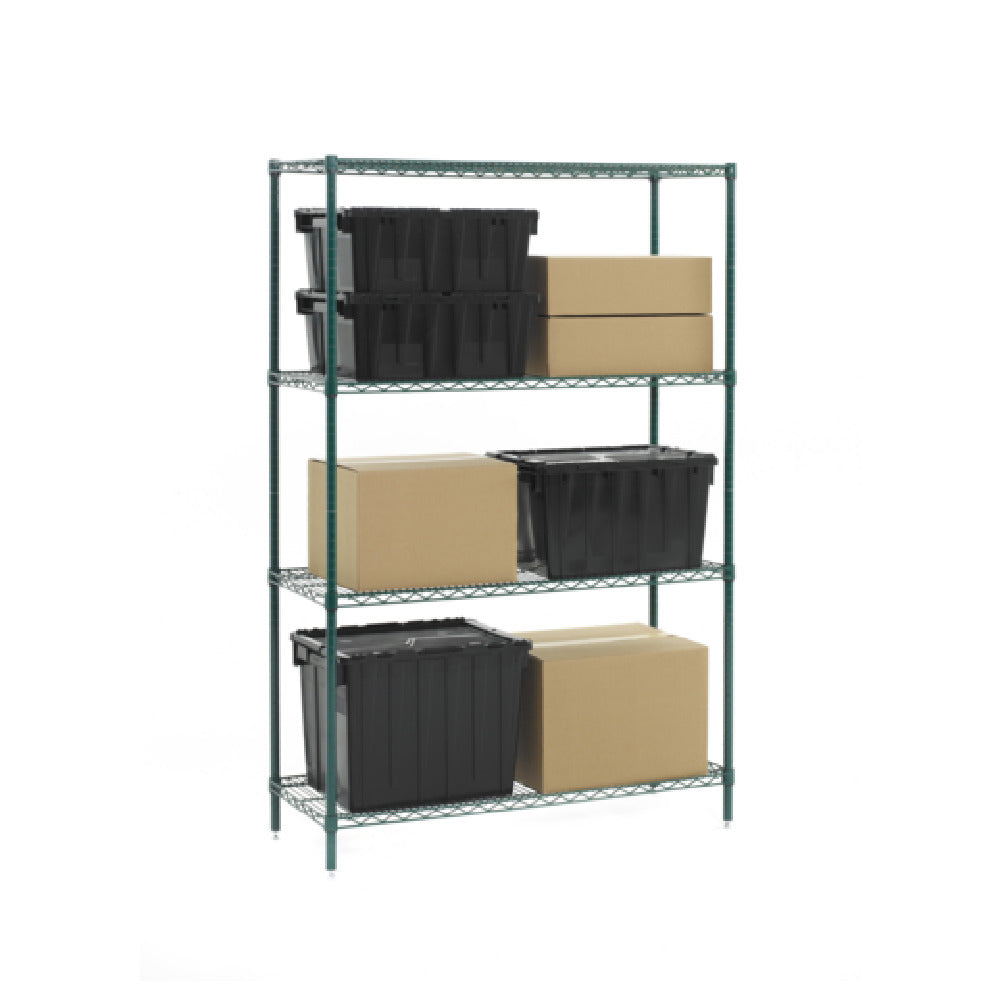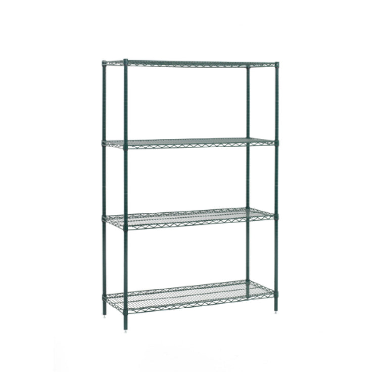 The OlympicJEZ1848K-4-SR POS Olympic™ Convenience Pack 18" X 48" 2000 Lb. Capacity Per Unit is a meticulously designed storage solution that caters to the diverse demands of various industry segments. This package includes four 18" x 48" adjustable wire shelves, providing ample flexibility to accommodate items of varying sizes and weights. The shelves are supported by four 74" split posts, ensuring a robust and stable framework. With a remarkable 2,000-pound capacity per unit, this product is ideal for environments requiring heavy-duty storage solutions. The green epoxy finish not only enhances durability by protecting against corrosion but also meets NSF standards, signifying its suitability for food-related industries that require stringent hygiene maintenance. The Olympic™ Convenience Pack stands out for its adaptability and reliability, making it an invaluable asset in sectors ranging from retail and food service to industrial and commercial storage. Its combination of strength, adjustability, and compliance with safety standards underscores its unique value proposition, appealing to businesses that prioritize efficiency, flexibility, and longevity in their storage infrastructure.