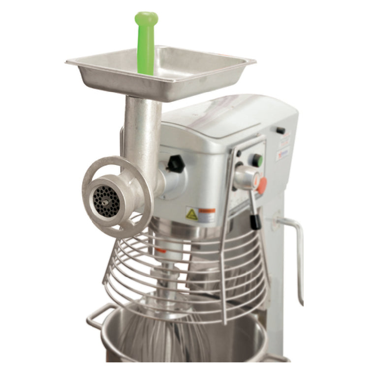 The Omcan 10051 Grinder Head Attachment Complete Unit is an essential tool for professionals in the food processing industry, known for its sturdy construction and versatile functionality. This attachment features a cast iron cylinder, providing durability and ensuring long-term use. It includes a ring and worm, which are crucial components for efficient grinding operations. The stainless steel feed pan is designed to facilitate easy handling and smooth processing of ingredients. With a #12 machine plate and #12 machine knife, the Omcan 10051 is compatible with #12 drive hubs, making it a versatile addition to various grinding setups. The unit also comes equipped with a stomper, enhancing safety and efficiency during operation. This grinder head attachment is ideal for markets that require reliable and robust equipment, such as butcher shops, restaurants, and food service establishments, where consistent and high-quality grinding is paramount. Its combination of high-grade materials and functional design ensures that it meets the rigorous demands of commercial settings, making the Omcan 10051 a valuable component for any professional kitchen setup seeking to enhance its grinding capabilities.