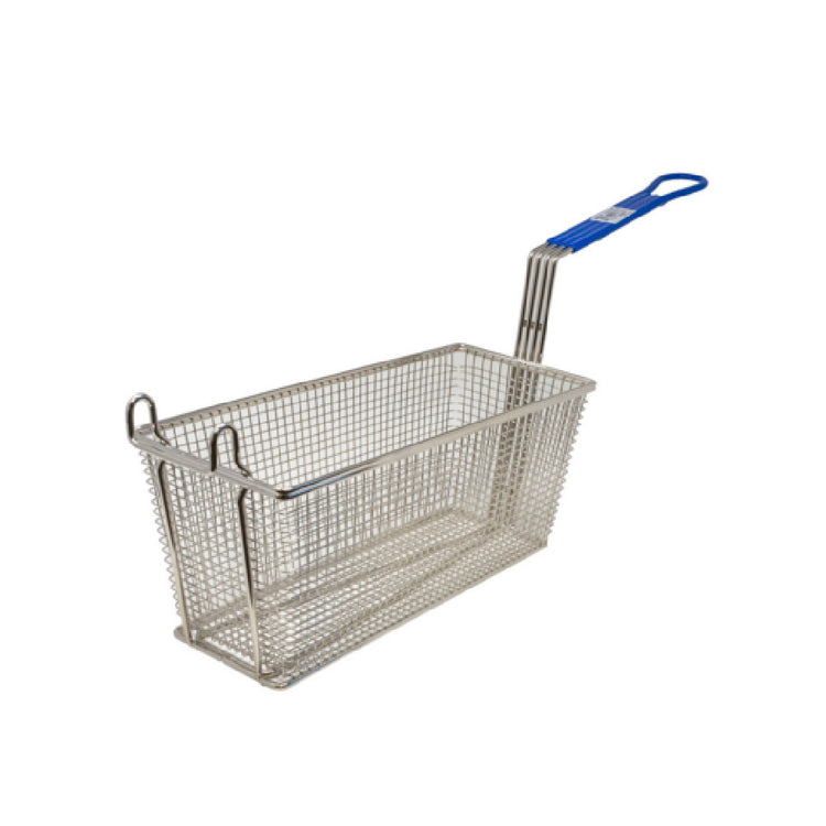 The Omcan 11366 (11366) Fryer Basket is an essential tool for professional kitchens, designed with precision and practicality. Measuring 13-1/4" in depth, 5-7/8" in width, and 5-5/8" in height, it provides ample space for frying tasks, making it suitable for a variety of culinary applications. The basket is equipped with a convenient hanging hook, enhancing storage efficiency when not in use. Constructed from nickel-plated iron, it offers durability and resistance to daily wear and tear, ensuring a long-lasting addition to any kitchen setup. The heat-resistant plastic blue handle not only provides a comfortable grip for users but also adds a layer of safety by minimizing the risk of burns during operation. This fryer basket is particularly beneficial for restaurants and food service establishments seeking reliable and robust kitchen equipment. Its sturdy design and functional features cater to the demands of high-volume frying operations, making it a versatile asset across different market segments within the industry, from fast-food outlets to large-scale catering services. The Omcan 11366 (11366) Fryer Basket stands as a testament to quality and efficiency in culinary tools, supporting chefs in delivering exceptional fried foods with ease and consistency.