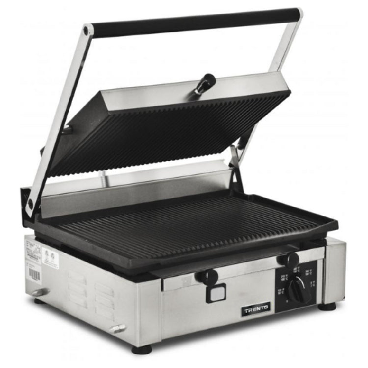The Omcan 11377 (PG-IT-0610-R) Elite Series Sandwich Grill Single 10" X 14" Grill Surface is a versatile appliance designed for culinary professionals seeking precision and reliability. Engineered with a 570°F thermostat control, it offers efficient heat regulation suitable for diverse grilling requirements. The grill features a robust cast iron ribbed top and bottom grilling surface, which enhances heat distribution, ensuring consistent results with every use. Its compact 10" x 14" grill surface is ideal for establishments with limited space but high standards for quality. Constructed with a durable stainless steel body, this grill is built to withstand the rigorous demands of a commercial kitchen. Operating at 110v/60/1-ph with a power output of 1.7kW and requiring 15 amps, it is equipped with a NEMA 5-20P plug for compatibility with standard electrical outlets. The Omcan 11377 is ETL and ETL-Sanitation certified, underscoring its adherence to strict safety and sanitation standards, and is proudly made in Italy. This grill is an optimal choice for cafes, restaurants, and food trucks, offering a combination of efficiency, durability, and performance, making it a valuable asset for any food service operation looking to enhance their sandwich and panini offerings.