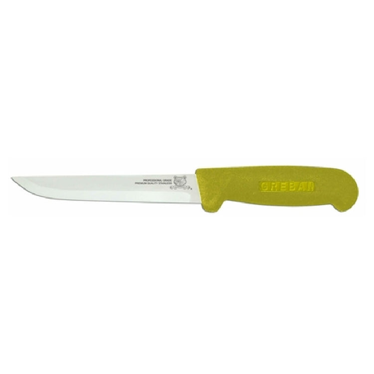The Omcan 11700 (11700) Boning Knife 6" Straight Blade is meticulously crafted for precision and durability, making it an indispensable tool for professional chefs and meat processing industries. This knife boasts a 6-inch straight blade, engineered from high-grade stainless steel, ensuring exceptional sharpness and resistance to corrosion. The straight blade design is particularly suited for boning tasks, allowing for clean cuts and improved control, which is essential in intricate meat processing and preparation tasks. Complementing its superior blade is the polypropylene handle, colored in yellow for easy identification and enhanced grip. This handle is not only ergonomic but also robust, offering comfort and safety during prolonged use. The choice of polypropylene aids in maintaining hygiene standards, as it is easy to clean and resistant to moisture. This boning knife is a vital asset for culinary professionals, catering to diverse market segments such as butcheries, restaurants, and catering services, where precision and reliability are paramount. Omcan USA, a respected name in kitchen tools, ensures that this knife meets rigorous standards of quality and functionality, making it a standout choice for those who demand excellence in their culinary endeavors.