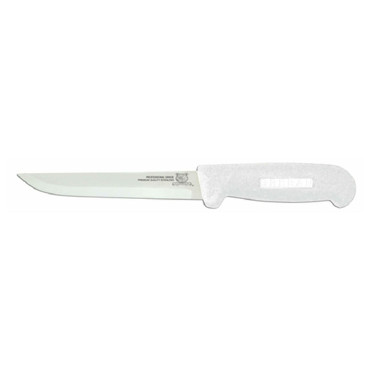 The Omcan 11717 (11717) Boning Knife 6" Straight Blade is a highly specialized tool designed for precision and efficiency in food preparation environments. This knife boasts a 6-inch straight blade crafted from high-quality stainless steel, ensuring durability and long-lasting sharpness for effective meat deboning tasks. It features a white polypropylene handle, which offers a secure and comfortable grip, enhancing the user's control and safety during use. The materials used in the construction of this knife are chosen for their robust properties, making it resistant to wear and corrosion, thus ideal for professional kitchens that demand reliability and high performance. Whether utilized in a large-scale industrial setting or a specialized culinary establishment, the Omcan 11717 Boning Knife delivers exceptional value through its ergonomic design and superior cutting capabilities. This knife meets the rigorous standards required by chefs and butchers, allowing for precise maneuvering and an efficient workflow. Its straightforward design emphasizes functionality and ease of maintenance, catering to the needs of diverse market segments within the food industry, from meat processing plants to gourmet restaurants. This versatile boning knife is a fundamental tool for professionals seeking efficiency and high-quality results in their culinary tasks.