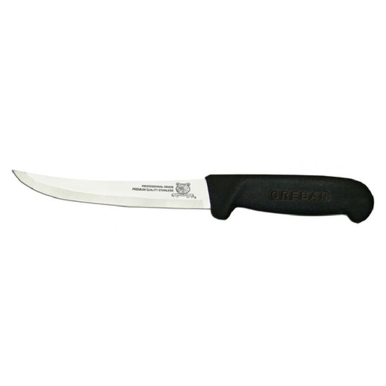 The Omcan 11814 (11814) Boning Knife 6" Curved is a specialized tool designed for precision and efficiency in meat processing. Featuring a 6-inch curved blade, this knife is expertly crafted to facilitate intricate cutting tasks, making it an indispensable asset for professional butchers, chefs, and culinary enthusiasts. The flexible blade is adept at maneuvering around bones, allowing for clean and precise cuts with minimal wastage. The ergonomic black handle provides a comfortable and secure grip, enhancing user control and reducing hand fatigue during extended use. Manufactured by Greban, a reputable name in culinary tools, the knife is classified as C-A, signifying its compliance with stringent quality and safety standards. This boning knife is particularly valuable in environments where detail and precision are paramount, such as high-end restaurants, butcher shops, and catering services. Its blend of flexibility, durability, and precision makes it a versatile tool suited for a variety of meat processing tasks, from delicate poultry work to robust red meat applications. Whether for professional or personal use, the Omcan 11814 Boning Knife is engineered to deliver superior performance and durability, making it a trusted choice within the culinary industry.