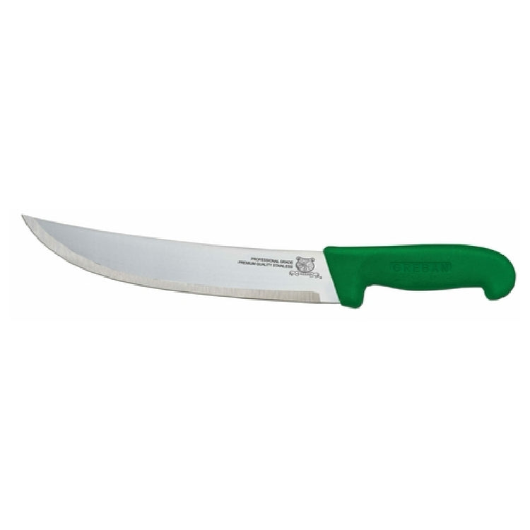 The Omcan 12215 - 12215 Steak Knife 10 Curved Blade is an expertly designed kitchen tool, specifically crafted for precision and efficiency in both professional and home culinary settings. Featuring a substantial 10-inch curved blade, this steak knife is ideal for slicing through a variety of meats with ease and accuracy. The blade is made from high-quality stainless steel, ensuring durability and resistance to rust and corrosion, which is essential for maintaining its sharpness and longevity. A distinctive attribute of this knife is its polypropylene green handle, which not only provides a comfortable and secure grip but also enhances safety and control during use, catering to both seasoned chefs and cooking enthusiasts alike. This thoughtfully engineered handle serves as a marker for easy identification among other kitchen tools, adding a splash of color and aiding in preventing cross-contamination, which is crucial in diverse food service environments. The Omcan 12215 steak knife is a testament to functional design and quality craftsmanship, offering a reliable solution for restaurants, catering businesses, and cooking schools, where precision and durability are a necessity. With its professional-grade specifications, this knife is a valuable addition to any culinary toolkit, aligning with the high standards expected in the food industry.