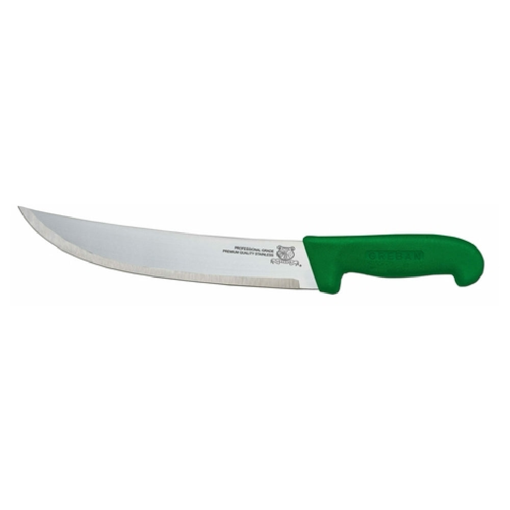 The Omcan 12273 (12273) Steak Knife is an expertly crafted utensil designed to meet the demands of professional kitchens and steak enthusiasts alike. Featuring a 12-inch curved blade, this steak knife is constructed from high-quality stainless steel, ensuring durability and resistance to corrosion. The blade's curvature is specifically designed to provide precision and ease when slicing through steaks, making it an indispensable tool for chefs and culinary experts who prioritize performance and efficiency. Complementing the sturdy blade is a polypropylene green handle, engineered for comfort and grip stability. The handle's material not only enhances the knife's ergonomic qualities but also contributes to its overall lightweight nature, reducing hand fatigue during prolonged use. This combination of a robust stainless steel blade and ergonomic handle makes the Omcan 12273 steak knife an ideal choice for various segments within the culinary industry, including restaurants, steakhouses, and catering services. Its design balances functionality with user comfort, appealing to both professional chefs and home cooking enthusiasts who value precision and quality in their culinary tools. This knife stands out in its category, offering a blend of technical excellence and practical design elements that enhance the dining and cooking experience.