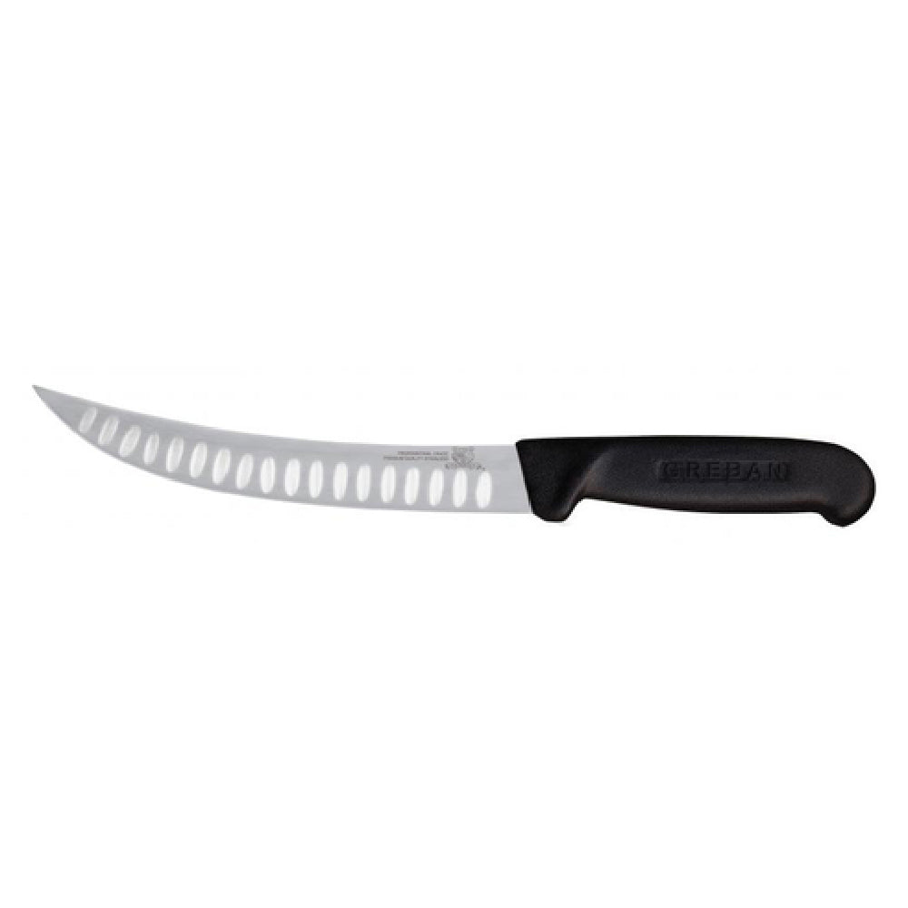 The Omcan 12356 Breaking Knife features an 8-inch curved Granton edge blade, crafted from high-quality stainless steel, ensuring durability and precision in every cut. The Granton edge design is particularly beneficial for reducing friction and preventing food from sticking to the blade, making it an ideal choice for professionals in the meat processing industry. This knife boasts a sleek black handle, designed by Greban, for a comfortable and secure grip, enhancing safety and control during use. Its design and specifications cater to various market segments, including butchers, chefs, and culinary enthusiasts, who demand precision and reliability in their cutting tools. The Omcan 12356 Breaking Knife is not just a tool but a professional’s ally in achieving optimal cutting performance with minimal effort. This knife's robust construction and ergonomic design make it an essential asset in any kitchen, providing long-lasting utility and exceptional cutting efficiency. Suitable for breaking down large cuts of meat, this knife stands out for its exceptional balance and ease of use, making it an indispensable tool for those who require both functionality and comfort in their culinary endeavors.