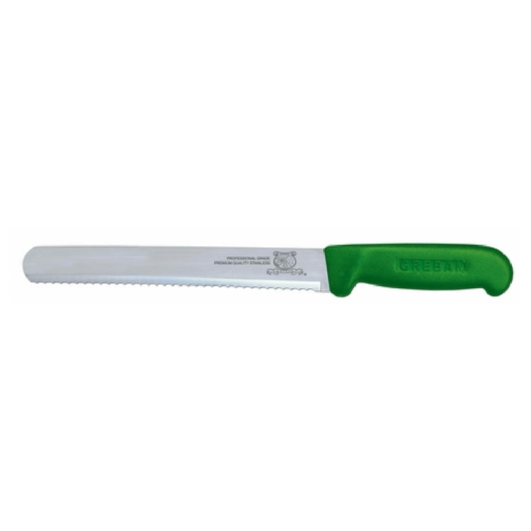 The Omcan 12662 (12662) Slicing Knife 10" Straight Blade is a precision-crafted tool tailored for culinary professionals and enthusiasts alike. This slicing knife is distinguished by its 10-inch straight blade, specifically designed to provide clean, effortless cuts. The wave edge of the blade enhances its slicing efficiency, making it an ideal choice for slicing through a variety of food items with precision and ease. The knife is equipped with a polypropylene green handle, which not only offers a comfortable and secure grip but also ensures durability and resistance to wear, making it suitable for high-volume kitchen environments. The distinct green color of the handle can assist in color-coordinated kitchen environments to reduce cross-contamination risks. This knife is particularly beneficial for chefs, caterers, and food service establishments that demand consistent performance and reliability in their cutting tools. The Omcan 12662 slicing knife's combination of a high-quality blade and ergonomic handle makes it an essential component in the toolkit of any culinary professional, offering a balance of functionality and durability that meets the rigorous demands of the foodservice industry.