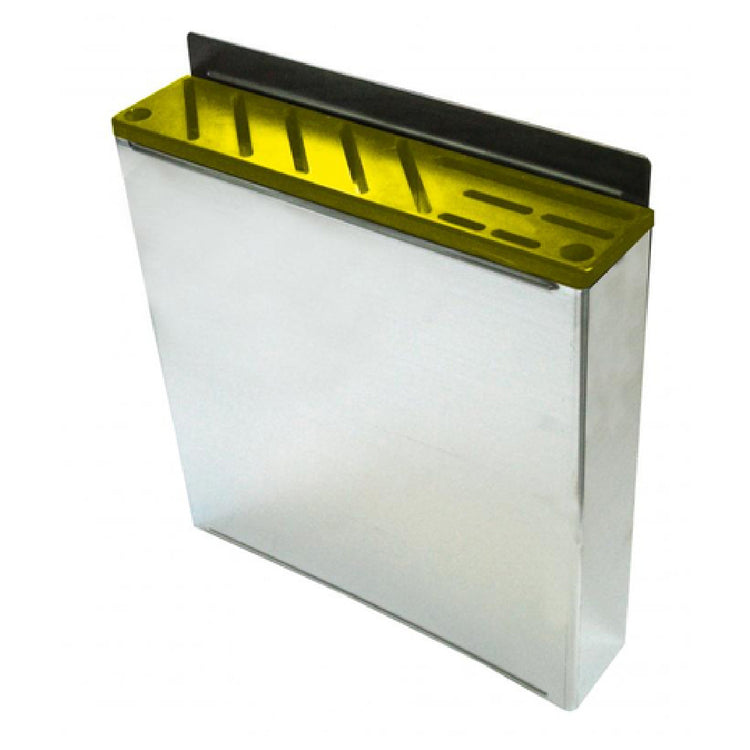 Omcan 12937 (12937) Knife Rack Small Stainless Steel is a compact and efficient storage solution for culinary professionals, offering an optimal organization system for kitchens with limited space. Constructed with durable stainless steel, this knife rack is designed to withstand the rigors of a busy kitchen environment while maintaining a sleek and professional appearance. The inclusion of a yellow plastic insert sets this knife rack apart, allowing for secure storage of up to 10 knives and 2 steels, ensuring chefs can keep their essential tools within easy reach. The carefully considered design not only maximizes space but also enhances kitchen safety by reducing the risk of accidents associated with loose or improperly stored knives. Ideal for small to medium-sized kitchens, this knife rack is well-suited for various industry segments, from bustling restaurant environments to smaller culinary spaces such as food trucks or catering operations. Its straightforward assembly and maintenance make it an attractive choice for chefs seeking to streamline their kitchen organization without sacrificing quality or safety. The Omcan 12937 knife rack represents a blend of functionality and practicality, making it an indispensable addition to any professional kitchen.