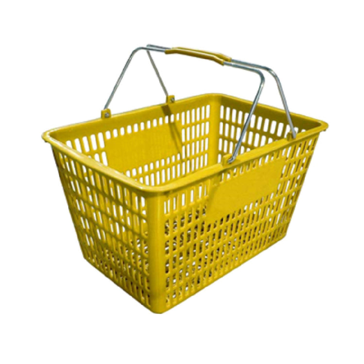 The Omcan 13027 (13027) Shopping Hand Basket is a practical and durable option for retail environments and supermarkets, designed to enhance the shopping experience for customers. This yellow plastic basket is equipped with a 50 lb capacity, accommodating a substantial amount of groceries or goods. Featuring two robust steel handles with a plastic coating, this basket ensures comfortable and secure handling. The steel handles provide strength and stability, while the plastic coating offers a smooth grip for ease of use and reduced strain. The bright yellow color not only adds a touch of vibrancy but also makes these baskets easily identifiable, improving store organization and efficiency. Ideal for various markets, from small convenience stores to large retail chains, the Omcan 13027 Shopping Hand Basket facilitates a seamless shopping process. Its sturdy construction and significant capacity make it a reliable tool for managing customer needs effectively. By combining durability with user-friendly features, this hand basket supports a positive shopping experience, catering to diverse customer preferences and store layouts.