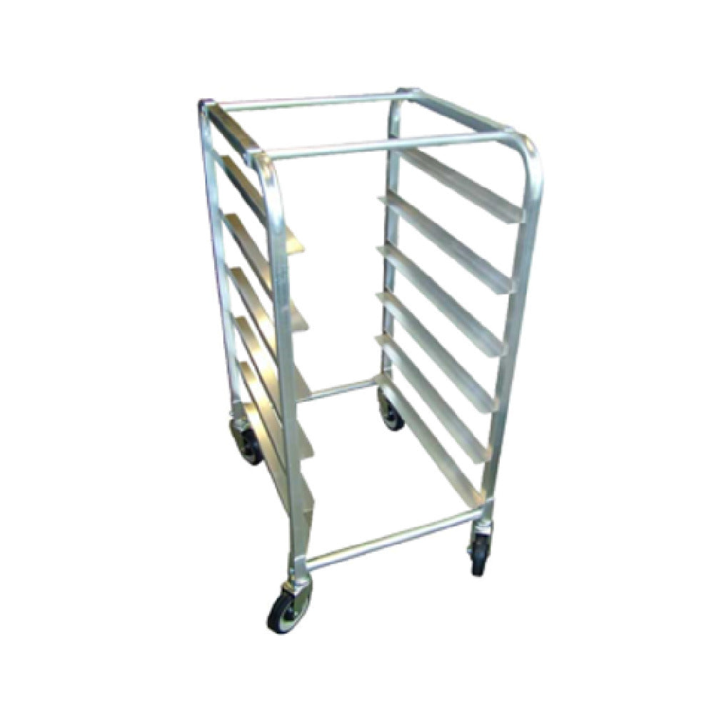 The Omcan 13497 (13497) Pan Rack Half Size Mobile is an efficient and versatile storage solution for commercial kitchens, bakeries, and catering services. Measuring 21-1/4 inches in width, 26-3/4 inches in depth, and 45 inches in height, this half-size mobile pan rack is designed to maximize space while providing ample storage with a capacity of six 18 x 26-inch pans. Featuring a user-friendly end-load design and open sides, it facilitates easy access to stored pans, which is crucial in fast-paced environments. The rack is constructed from durable aluminum, ensuring longevity and resistance to corrosion, which is vital for rigorous daily use. Its curved top design adds a sleek aesthetic while its 6-inch spacing between shelves accommodates a variety of pan types and sizes. Equipped with 5-inch casters, this pan rack is highly mobile, allowing for seamless movement throughout the kitchen or transport to different locations, enhancing operational efficiency. The knock-down (KD) construction makes it convenient for shipping and assembly. The Omcan 13497 pan rack is a practical choice for businesses seeking reliable and flexible storage solutions that support daily operations and optimize kitchen workflows within the foodservice industry.
