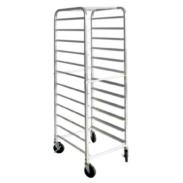 The Omcan 13504 (13504) Pan Rack Full Size Mobile is a versatile and sturdy storage solution designed to meet the demands of commercial kitchens, bakeries, and food service establishments. This full-size pan rack measures 21-1/4 inches in width, 26-3/4 inches in depth, and 71 inches in height, providing ample space for accommodating up to 12 pans, each measuring 18 inches by 26 inches. The rack is designed with open sides and an end load configuration, allowing for easy access and efficient loading and unloading of pans. Its curved top adds a subtle design enhancement, ensuring it fits seamlessly into various kitchen layouts. Constructed from durable aluminum, the Omcan 13504 pan rack promises longevity and resilience in high-use environments. It features a 5-inch spacing between the shelves, optimizing storage capacity while maintaining ease of use. Equipped with 5-inch casters, this pan rack offers excellent mobility, allowing staff to transport pans effortlessly across different areas within the kitchen. The unit is shipped in a knockdown (KD) format on a pallet, ensuring safe and compact delivery. The Omcan 13504 is an essential asset for establishments requiring reliable and efficient pan storage and mobility solutions.