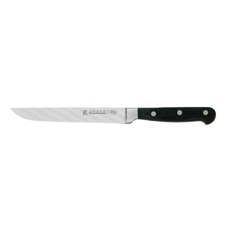 The Omcan 17891 (17891) Boning Knife 6" Straight is a precision instrument crafted for culinary professionals and butcher shops, emphasizing exactitude in meat preparation. This boning knife features a 6-inch straight blade, ideal for intricate tasks such as deboning and trimming, providing the versatility necessary for various meat processing needs. Forged for strength and durability, the blade ensures long-lasting performance, maintaining sharpness through extensive use. The knife's design incorporates a black handle, offering a comfortable and secure grip, which is crucial for maintaining control during meticulous cutting tasks. With its robust construction and ergonomic design, the Omcan 17891 Boning Knife is particularly suited for high-volume environments requiring precision and consistency. Whether employed in a professional kitchen or a meat processing facility, this knife stands out for its ability to facilitate efficient and accurate meat preparation, making it an invaluable tool across the culinary and food service industry. This specialized boning knife not only enhances productivity but also upholds the high standards required in food preparation, ensuring clean cuts and minimal meat wastage. Its combination of a straight blade and comfortable handling makes it an essential asset for chefs and meat processors aiming for excellence in their craft.