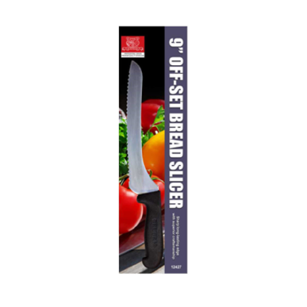 The Omcan 21881 (21881) Slicing Knife is a specialized kitchen tool designed for precision and efficiency. Featuring an off-set blade, this knife provides enhanced control and comfort, reducing the strain on the wrist during prolonged use. The 9-inch wave edge blade is crafted to handle a variety of slicing tasks with ease, making it suitable for both professional chefs and home cooks seeking high-performance tools. The wave edge design ensures smooth slicing, allowing for clean cuts without tearing or shredding the food, which is particularly beneficial for delicate items like bread, tomatoes, and soft fruits. Its black handle is ergonomically designed, providing a secure and comfortable grip even in wet conditions, thereby enhancing safety and precision. Retail packaged, this slicing knife is a versatile addition to any kitchen, addressing the needs of culinary professionals in restaurants and catering services, as well as the everyday demands of home cooking enthusiasts. This expertly crafted knife from Omcan USA is synonymous with durability and reliability, making it an essential tool for achieving professional-grade results in any kitchen setting.