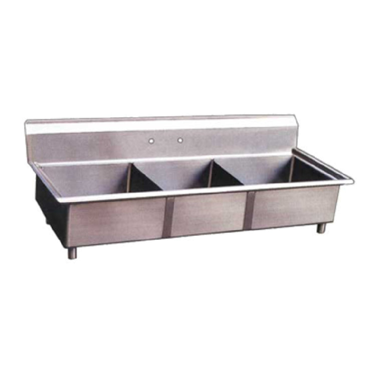 The Omcan 22114 (22114) Pot Sink is a versatile and durable kitchen solution, featuring three bowls each measuring 18 inches front to back, 18 inches wide, and 11 inches deep. This makes it a practical choice for a variety of commercial kitchen environments, such as restaurants, cafeterias, and food service operations that require efficient space for washing pots and pans. The sink is constructed from 18-gauge, 304 stainless steel, providing excellent durability and resistance to corrosion, essential for high-volume kitchen usage. It features 8-inch center faucet holes and a 9-3/4-inch backsplash, designed to minimize water spillage and maintain a tidy workspace. The corner drains facilitate easy water disposal, enhancing the overall functionality of the sink. Supported by galvanized legs with adjustable bullet feet, this pot sink ensures stability and allows for height adjustments to suit different kitchen setups. Additionally, being NSF and CSA certified, it meets the necessary health and safety standards for commercial kitchen equipment. The Omcan 22114 Pot Sink is shipped on a pallet, ensuring secure transport and ease of handling upon delivery. Its robust construction and practical design make it an invaluable asset for any commercial kitchen setting.