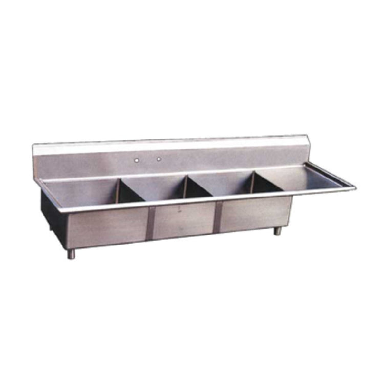 The Omcan 22116 Pot Sink is a highly functional kitchen essential, featuring three robust bowls each measuring 18 inches from front to back, 18 inches in width, and 11 inches in depth. Designed to meet the rigorous demands of professional kitchens, this pot sink is constructed from high-quality 18-gauge, 304 stainless steel, ensuring both durability and resistance to corrosion. The sink is engineered with 8-inch center faucet holes, facilitating easy installation of compatible faucets for efficient water management. An integrated 9-3/4-inch backsplash is included to protect walls from splashes and spills, enhancing hygiene and cleanliness in any environment. The sink's corner drains and right drain board allow for optimal water drainage and space utilization. Supported by galvanized legs with adjustable bullet feet, the Omcan 22116 Pot Sink provides stability and adaptability on uneven surfaces. This product is NSF and CSA certified, highlighting its adherence to public health and safety standards. Delivered on a pallet for secure transportation, this pot sink is an invaluable asset for restaurants, catering businesses, and any commercial kitchen requiring reliable and spacious cleaning stations. Its design and features make it ideal for diverse segments within the food service industry, ensuring seamless operations and maintenance.