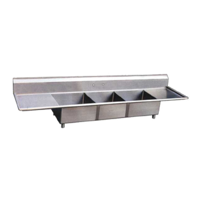 The Omcan 22117 (22117) Pot Sink is a robust kitchen solution, designed to meet the high demands of commercial food service environments. Featuring three bowls, each measuring 18 inches front to back, 18 inches wide, and 11 inches deep, this sink provides ample space for efficient cleaning and washing tasks. With 8-inch center faucet holes and a 9-3/4 inch backsplash, it ensures easy installation and protection against water splashes, safeguarding your kitchen walls. The inclusion of corner drains and both left and right drain boards facilitates seamless workflow and efficient water drainage. Constructed from 18-gauge, 304 stainless steel, the sink offers excellent durability and resistance to corrosion, making it ideal for long-term use. Galvanized legs with adjustable bullet feet provide stability and allow for precise leveling on uneven surfaces. Certified by NSF and CSA, the Omcan 22117 Pot Sink adheres to rigorous health and safety standards, ensuring suitability for a wide range of industrial applications. Shipped securely on a pallet, this sink is engineered to meet the diverse needs of restaurants, hotels, and catering services, combining functionality with robust construction to support high-volume kitchen operations.