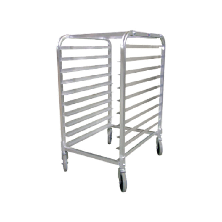 The Omcan 22128 (22128) Pan Rack Full Size Mobile is a versatile kitchen essential designed to support the demanding needs of professional culinary environments. This full-size mobile pan rack features dimensions of 21"W x 26"D x 38"H, providing ample space for efficient storage and transport of pans. Its design incorporates an end load mechanism with open sides and a curved top, which facilitates easy access and loading of pans. The rack accommodates up to ten 18" x 26" pans with 3" spacing between them, optimizing capacity without compromising accessibility. Constructed from durable aluminum, the Omcan 22128 ensures longevity and resilience in busy kitchen settings. The inclusion of 5" casters enhances mobility, allowing the rack to be easily maneuvered across various surfaces. The KD (knock-down) design implies that the rack can be disassembled for convenient storage or transport when not in use. This pan rack is an indispensable asset for bakeries, catering services, and commercial kitchens, offering a practical solution for organized and efficient pan handling and storage. Its robust build and thoughtful design make it ideal for any food service operation seeking reliability and efficiency in their kitchen equipment.