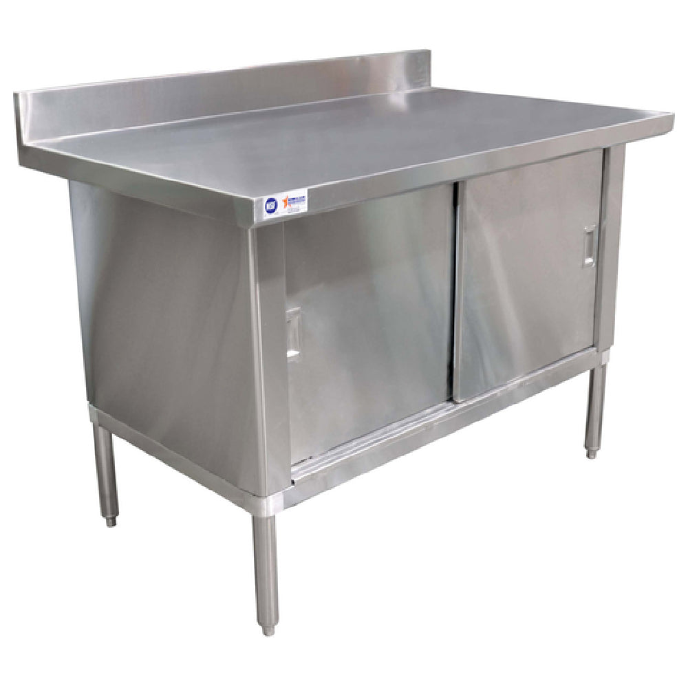 The Omcan 24404 (24404) Work Table Cabinet Base With Sliding Doors is a precision-engineered piece of equipment, measuring 60"W x 30"D x 38"H, which perfectly caters to the needs of various industry segments, particularly in foodservice and laboratory environments. Constructed with an 18-gauge 430 stainless steel flat top, it features a 3" front overhang and a practical 4" backsplash, making it ideal for maintaining a hygienic and efficient workspace. The cabinet base is equipped with smooth sliding doors, providing ample storage while maximizing accessibility and space utilization. Supported by durable stainless steel legs, the table's stability is further ensured with adjustable plastic bullet feet, allowing for customization to suit uneven flooring surfaces. The unit's knock-down (KD) design facilitates easy shipping and assembly, arriving on a pallet for straightforward setup. NSF certification attests to its compliance with stringent safety and sanitation standards, reinforcing its suitability for professional settings. This versatile work table is adept at addressing the diverse needs of its users, offering a robust and reliable solution that underscores Omcan USA's commitment to quality and functionality in its products.