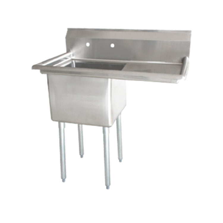 Omcan 25254 Pot Sink is expertly crafted to meet the rigorous demands of commercial kitchens, featuring a single bowl measuring 24 inches front to back, 24 inches wide, and 14 inches deep. This pot sink is designed with 8-inch center faucet holes for versatile fixture compatibility, making it a suitable choice for various kitchen setups. The 9-3/4-inch backsplash provides additional protection against water splashes, ensuring cleanliness and maintenance convenience. It incorporates a right drain board, allowing for efficient water drainage and workspace organization. The sink's corner drains enhance water flow, minimizing pooling and maximizing sanitation. Constructed from 18-gauge, 304 stainless steel, the Omcan 25254 Pot Sink promises durability and longevity, essential for high-volume environments. Its galvanized legs with adjustable bullet feet provide stable support and balance on uneven surfaces, making it adaptable to different flooring conditions. Shipped on a pallet for secure transportation, this sink is NSF certified, underscoring its adherence to public health and safety standards. Ideal for restaurants, hotels, and catering services, the Omcan 25254 Pot Sink offers a practical and reliable solution for efficient kitchen operations.