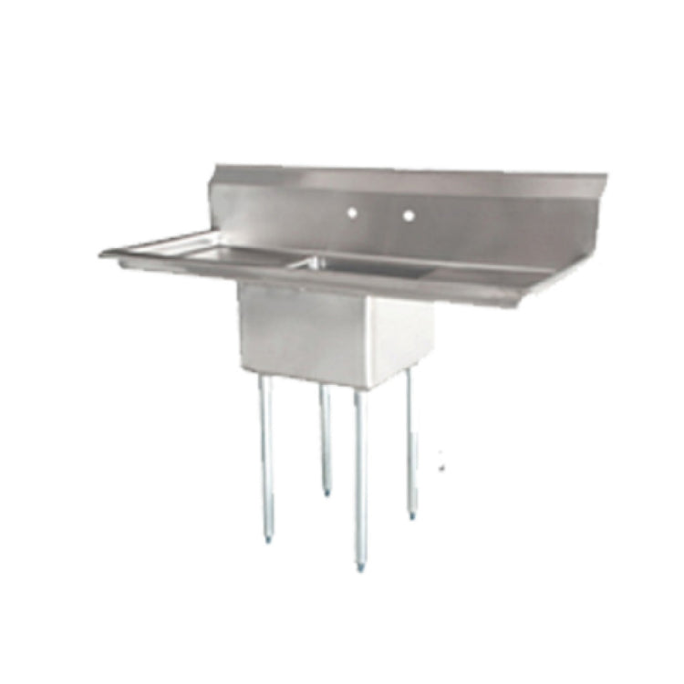 The Omcan 25255 Pot Sink is a meticulously designed kitchen fixture, ideal for various industry segments like restaurants, catering services, and large-scale food preparation areas. This model features a single bowl measuring 24 inches front to back, 24 inches wide, and 14 inches deep, providing ample space for handling large pots and utensils. It is equipped with 8-inch center faucet holes for easy installation of compatible faucets. The sink includes a practical 9-3/4 inch backsplash, which helps protect walls from water damage during intensive cleaning tasks. The corner drains ensure efficient water drainage, complemented by left and right drain boards for added convenience and workflow efficiency. Constructed from 18 gauge, 304 stainless steel, this sink promises durability and resistance to corrosion, while its galvanized legs with adjustable bullet feet offer superior stability and adaptability to uneven surfaces. Certified by NSF, the Omcan 25255 guarantees compliance with strict public health standards, ensuring safety and hygiene in professional settings. This pot sink is shipped on a pallet, facilitating secure transportation. Overall, the Omcan 25255 Pot Sink is an essential component for high-demand culinary environments, providing robust functionality and enduring performance.