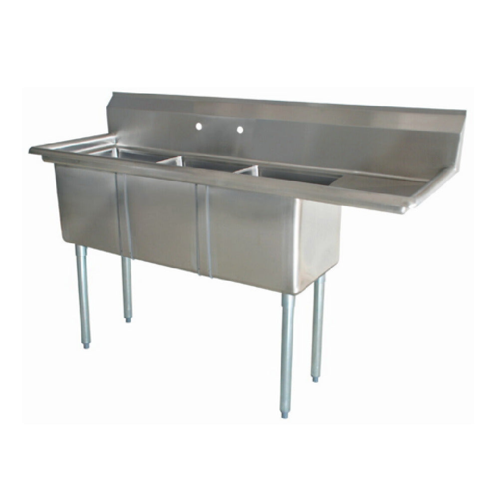 The Omcan 25272 (25272) Pot Sink is a versatile and robust solution designed for demanding kitchen environments, featuring three bowls measuring 21 inches front to back, 18 inches wide, and 14 inches deep. This sink model is engineered with 8-inch center faucet holes and a 9-3/4 inch backsplash, allowing for easy installation and effective splash protection. Its corner drains and right drain board facilitate efficient water management, minimizing water accumulation. Constructed from 18-gauge, 304 stainless steel, the Omcan 25272 ensures durability, corrosion resistance, and compliance with NSF standards, making it an ideal choice for commercial kitchens. The sink is supported by galvanized legs with adjustable bullet feet, providing stability and adaptability to uneven surfaces. Shipped on a pallet for secure transportation, this pot sink addresses the needs of various market segments within the industry, including restaurants, catering services, and food processing facilities, where hygiene and durability are top priorities. Its thoughtful design and high-grade materials make the Omcan 25272 a reliable asset for maintaining cleanliness and efficiency in food service operations.