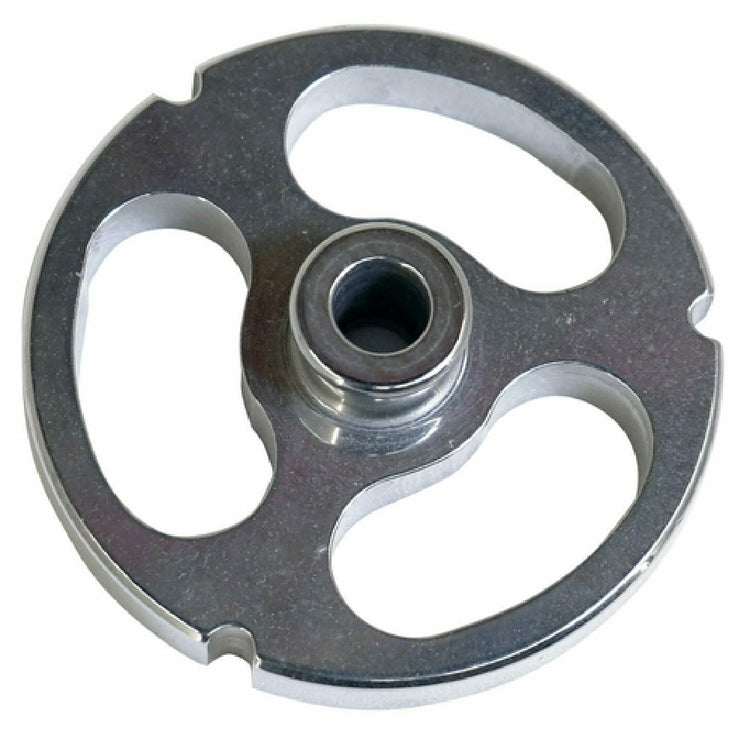 The Omcan 27871 (27871) Machine Kidney Plate #32-3 holes in hard steel is a specialized component designed for precision and durability in industrial meat processing applications. Manufactured to fit #32 grinders, this kidney plate features three meticulously crafted holes that ensure consistent and efficient meat grinding operations. Crafted from hard steel, the plate boasts exceptional strength and longevity, making it suitable for high-volume processing environments where reliability and performance are paramount. This specific configuration is tailored for operations that require robust equipment to handle extensive workloads without compromising on quality. The Omcan 27871 kidney plate caters to a broad spectrum of users within the meat processing industry, from small butcher shops to large-scale processing facilities, providing a versatile and reliable solution for meat grinding tasks. Its design and material composition underscore its suitability for professional use, where precision and durability are critical. The Omcan brand is associated with high-quality machinery, and this kidney plate upholds that reputation by offering a critical component that enhances the functionality and efficiency of meat grinders, enabling professionals to meet their production needs effectively.