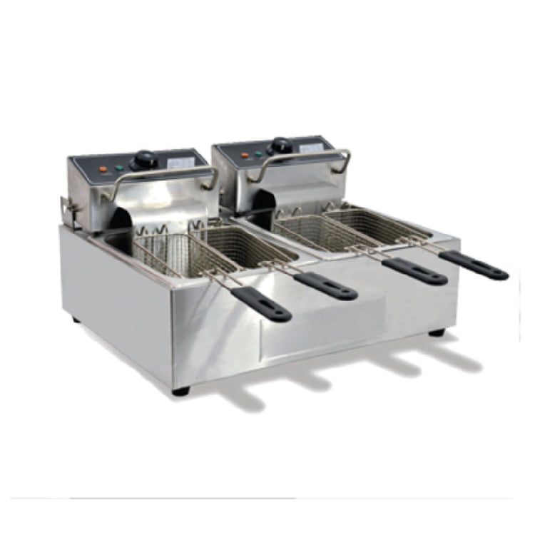 The Omcan 34868 (CE-CN-0012) Double Countertop Fryer Electric is a compact yet powerful appliance designed for efficient frying operations. With overall dimensions of 22-3/4"W x 17-1/2"D x 11-3/4"H, this fryer fits seamlessly into various kitchen settings. It features two full fry pots, each with a 6-quart (7-liter) capacity, making it suitable for small to medium-sized food establishments. The fryer includes four baskets, each measuring 8-1/4" x 3-1/2" x 4-1/4", allowing for simultaneous frying of multiple items. Equipped with two adjustable thermostats, it offers a wide temperature range from 122°F to 374°F (50°C to 190°C), providing precise control over the frying process. Safety is enhanced by a limit switch, ensuring reliable operation. The stainless steel body not only ensures durability but also adds a sleek aesthetic to any countertop. Each fryer boasts a 1.35kW power output, operating on 110v/60/1-ph with 11.25 amps per unit, and comes with two cords featuring NEMA 5-15P plugs. The Omcan 34868 is an excellent choice for restaurants, cafes, and catering services looking for a versatile and efficient frying solution.
