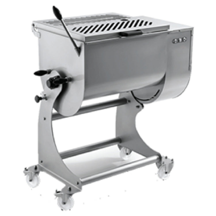 Omcan 37450 (MM-IT-0080) Meat Mixer Floor Model Electric is a high-capacity meat mixing solution designed for efficiency and safety in industrial kitchen environments. This robust mixer boasts an impressive 80 kg (110 liter) capacity, providing ample space for large-scale mixing tasks. Its 24" x 20" tilting tank is equipped with an automatic locking system, ensuring secure operation during use. The mixer features a safety lock mechanism, enhancing user safety. For flexibility and thorough mixing, the unit is equipped with (2) removable stainless steel mixing arms, which can be easily detached for cleaning and maintenance. The stainless steel cover includes a safety microswitch, adding an additional layer of protection. Constructed from 304 stainless steel, the mixer ensures durability and resistance to corrosion. The swivel casters with locks facilitate easy mobility and secure positioning within the workspace. Powered by (2) 3/4 HP motors, the mixer operates at 220v/60/1-ph, ensuring efficient performance. This model is CE and cETLus certified, meeting rigorous safety and quality standards. Manufactured in Italy, the Omcan 37450 is shipped on a pallet, ready to support professional kitchens with its reliable and hygienic mixing capabilities.