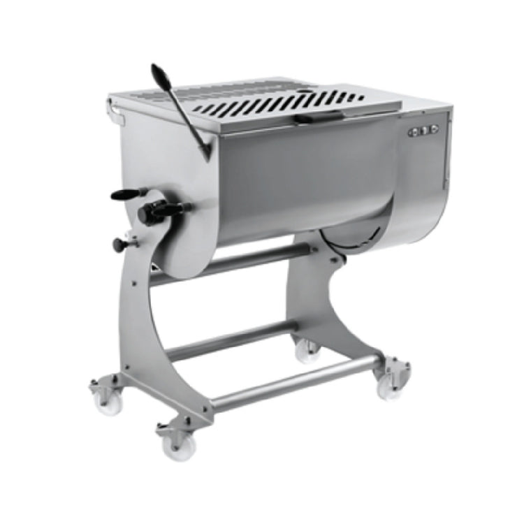 The Omcan 37451 (MM-IT-0120) Meat Mixer Floor Model Electric is a high-capacity solution designed for heavy-duty meat processing needs, boasting a substantial capacity of 120 kg (163 liters). This model features a 26" x 21.7" tilting tank with an automatic locking system, ensuring safety and ease of use during operation. With a safety lock and a stainless steel cover equipped with a safety microswitch, this mixer prioritizes user safety. The two removable stainless steel mixing arms facilitate thorough mixing and easy cleaning, while the overall 304 stainless steel construction guarantees durability and corrosion resistance. The mixer is mounted on swivel casters with locks, providing both mobility and stability in busy environments. Powered by two 1 HP motors and utilizing a 220v/60/3-ph electrical system, it delivers robust performance suitable for commercial kitchens. Certified by CE and cETLus, the Omcan 37451 adheres to high safety and efficiency standards, and its Italian craftsmanship ensures quality and reliability. The unit is shipped on a pallet, ensuring secure transportation. This meat mixer is an excellent choice for meat processing operations, offering both efficiency and safety in a well-engineered package.