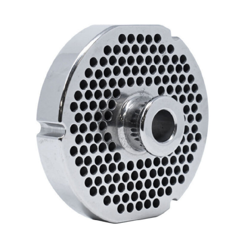 The Omcan 39325 (39325) Machine Plate With Hub #521/4" (6.4mm) is a high-quality stainless steel component, expertly crafted for durability and precision in meat processing applications. Featuring three notches and two flat sides, this machine plate is designed to fit seamlessly into meat grinders and processors requiring a #52 hub, ensuring a perfect fit for efficient operations. The plate's 1/4" (6.4mm) size allows for a consistent grind, making it suitable for a variety of meat textures and recipes. Its stainless steel construction not only promises longevity and resistance to corrosion but also ensures compliance with hygiene standards critical in food processing environments. This machine plate is a valuable asset for butchers, commercial kitchens, and food production facilities seeking reliable performance and precision in meat preparation. The Omcan 39325 (39325) Machine Plate's technical specifications cater to professionals who demand accuracy and efficiency, providing an indispensable tool in the meat processing industry.