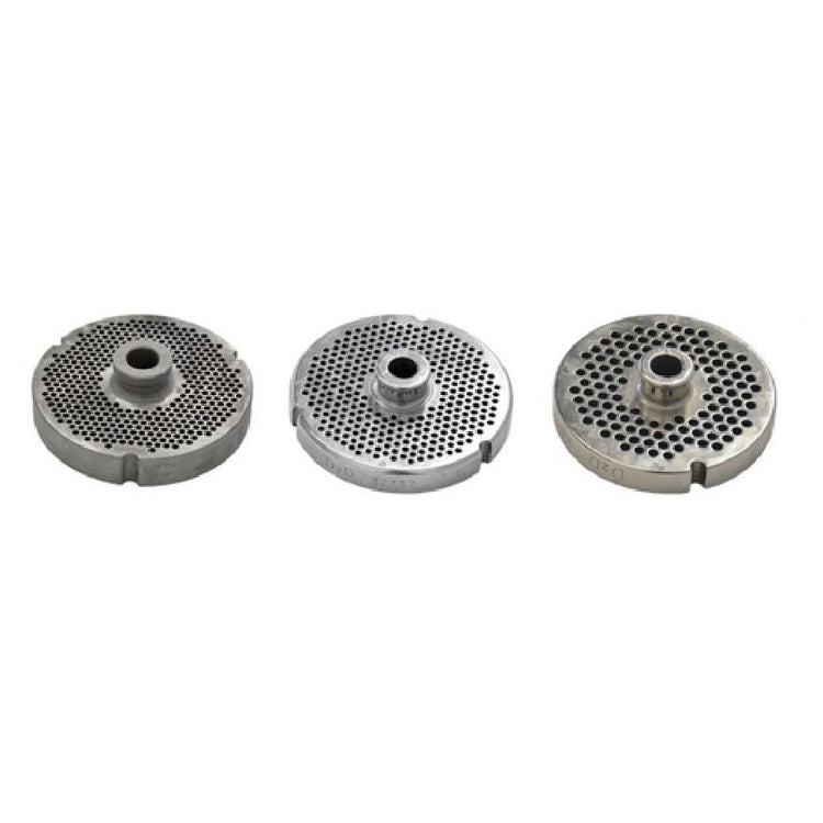 The Omcan 39476 (39476) SS #52 Machine Plate With Hub 9.5 Mm (3/8") 3 Notches With Two Flat Sides is a specialized component meticulously crafted for use in high-capacity meat grinding operations. This machine plate is characterized by its stainless steel construction, ensuring durability and resistance to corrosion, which is crucial for maintaining hygiene standards in food processing environments. Designed with precision, it features a hub for secure attachment, and its 9.5 mm (3/8") hole size offers optimal grinding performance for medium coarse textures. The plate's three notches and two flat sides facilitate easy alignment and installation, enhancing operational efficiency. Ideal for large-scale commercial kitchens, butcheries, and meat processing facilities, this component ensures consistent results and reliability under heavy-duty use. Its compatibility with #52 grinder models makes it a versatile choice for various industry segments, providing a balance of performance and longevity. The Omcan 39476 plate is a crucial asset for professionals seeking to optimize their grinding processes while adhering to stringent quality standards.