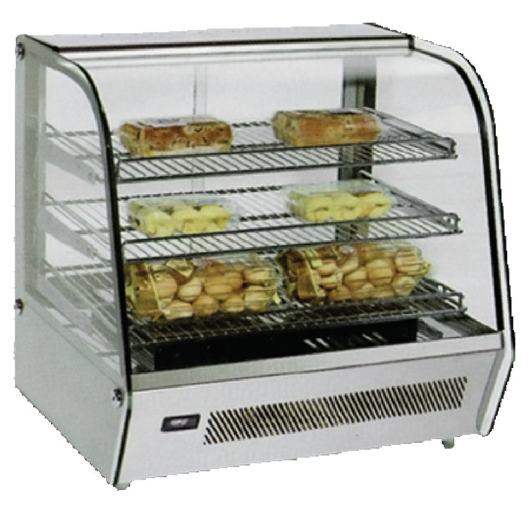 The Omcan 39535 (DW-CN-0120) Display Warmer Case Countertop 26-3/4"W is a versatile appliance designed for optimal food presentation and temperature maintenance. With its full-service design and elegant curved glass front, this display warmer is ideal for enhancing the visibility of your food offerings while maintaining their freshness. It features a spacious 4.24 cubic feet interior capacity, allowing for ample storage of various food items. The unit operates within a temperature range of 86°F (30°C) to 194°F (90°C), which can be precisely controlled via a digital adjustable temperature controller to ensure consistent heating. Equipped with three adjustable shelves, the display warmer accommodates a variety of serving configurations. Its interior LED lighting enhances product visibility, making it perfect for both retail and service environments. The sliding rear doors and glass sides provide easy access and allow a clear view of the contents. Operating at 1.1kW with a power requirement of 110v/60/1-ph, it includes a cord with a NEMA 5-15P plug for straightforward installation. This unit is CE certified and shipped on a pallet, ensuring that it meets high standards of quality and safety. The Omcan 39535 display warmer is a practical choice for foodservice operations seeking reliability and efficiency.
