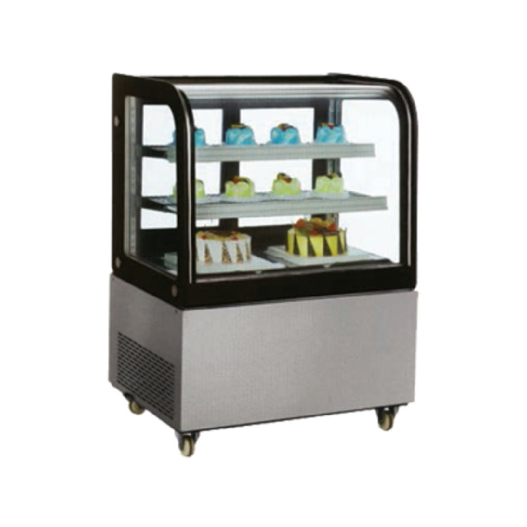 The Omcan 39539 (RS-CN-0270) Curved Glass Refrigerated Display Case Floor Model is a meticulously engineered solution for showcasing chilled products in various commercial settings. With dimensions of 36"W x 26-3/5"D x 50-1/5"H, this unit offers a spacious interior capacity of 9.5 cu.ft, accommodating a range of product volumes efficiently. It maintains optimal temperatures between 35.6°F (2°C) and 46.4°F (8°C), facilitated by a digital temperature controller and display, ensuring precise climate control suited for diverse market segments including bakeries, cafes, and delis. The display case features a sliding rear glass door for easy access, complemented by two adjustable chrome-plated shelves, allowing customization of display layouts. Its automatic defrost system and internal LED lighting enhance product visibility and preservation. Constructed with a stainless steel interior and exterior, the display case is both durable and aesthetically appealing. The bottom-mounted self-contained refrigeration, utilizing R290 Hydrocarbon refrigerant, ensures efficient cooling. This model is equipped with two swivel and two swivel/brake casters for mobility, and requires an electrical input of 410 watts, 5.5 amps, 110v/60/1-ph. Certified by cETLus and ETL-Sanitation, the Omcan 39539 is a reliable and maintenance-free refrigeration solution shipped on a pallet for practicality.