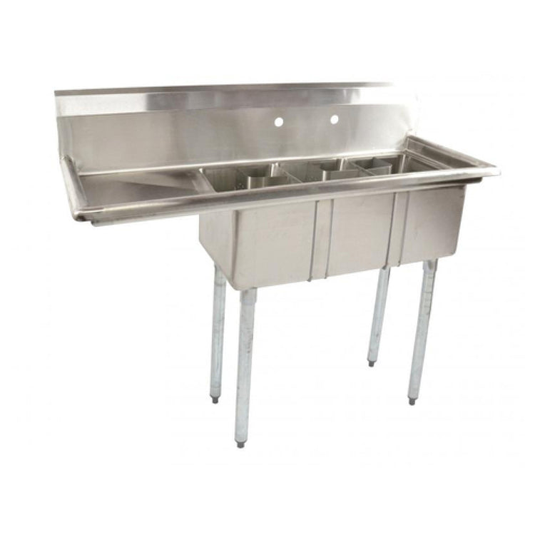 The Omcan 39762 (39762) Space Saver Sink is designed for operations where maximizing kitchen space without compromising functionality is crucial. This model features three compact bowls, each measuring 14 inches front to back, 10 inches in width, and 10 inches in depth, providing ample space for efficient dishwashing and food preparation in confined spaces. Equipped with two 1-inch center faucet holes, it offers flexibility in faucet installation, meeting diverse operational needs. The sink is complemented by a 9-3/4-inch backsplash that prevents water spillage and maintains cleanliness by safeguarding the wall surface from splashes. Its corner drains ensure effective drainage, minimizing water pooling in the bowls. The 16-inch left drain board provides additional space for drying or staging items. Constructed from 18-gauge, 304 stainless steel, this sink delivers durability and resistance to corrosion and rust, ensuring longevity even in rigorous commercial environments. The 16-gauge galvanized legs with adjustable bullet feet offer stability and customization to fit uneven flooring, enhancing workplace safety and efficiency. NSF certification assures compliance with public health standards. The Omcan 39762 Space Saver Sink is an ideal solution for food service establishments looking to optimize space while maintaining high standards of hygiene and functionality.