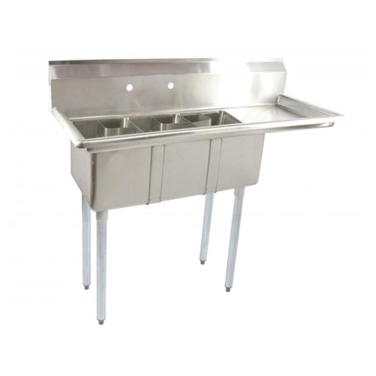The Omcan 39763 Space Saver Sink is a versatile solution designed for commercial kitchens with limited space yet high functionality requirements. This unit features three individual bowls, each measuring 14 inches from front to back by 10 inches wide and 10 inches deep, allowing for efficient multitasking in confined areas. The sink is equipped with two 1-inch center faucet holes, offering flexibility in faucet installation to meet specific operational needs. A 9-3/4-inch backsplash protects kitchen walls from water splashes, enhancing cleanliness and maintenance ease. The corner drains facilitate swift water removal, while the 16-inch right drain board provides additional workspace for drying or prep activities. Constructed with 18-gauge, 304 stainless steel, the sink ensures durability and resistance to corrosion, essential for long-term use in a demanding environment. The 16-gauge galvanized legs, complete with adjustable bullet feet, provide stability and adaptability to uneven surfaces, ensuring safety and convenience. Certified by NSF, this sink adheres to stringent public health standards, making it a reliable choice for a variety of food service establishments. Whether utilized in a bustling restaurant, a compact café, or a dynamic catering setup, the Omcan 39763 Space Saver Sink delivers efficiency and durability.