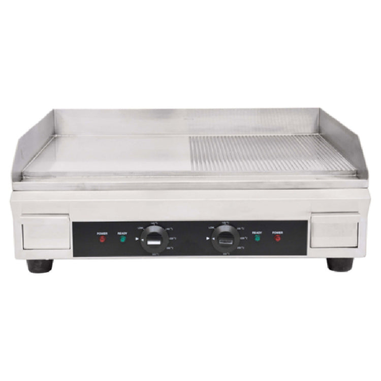 The Omcan 41373 (CE-CN-0610-FR) Griddle Countertop Electric is a versatile cooking appliance designed for both commercial kitchens and home culinary enthusiasts. Featuring a generous 23.87" x 16" cooking area, it provides ample space for preparing a variety of dishes simultaneously. The griddle surface is uniquely divided into a half ribbed and half smooth configuration, catering to diverse cooking preferences and techniques. It is equipped with two independent thermostat controls, allowing precise temperature adjustments ranging from 140°F to 572°F (60°C to 300°C), ideal for achieving optimal cooking results. The griddle's front grease trough and chute facilitate efficient grease management, promoting a cleaner cooking environment. Constructed from durable stainless steel, the Omcan 41373 griddle ensures longevity and ease of maintenance. With a power output of 3.6kW and operating on a 240v/60/1-ph electrical setup, it connects via a cord with a NEMA 6-20P plug. Shipped on a pallet for secure transportation, this griddle is an excellent addition to any food service operation, offering both functionality and reliability in a compact countertop design.