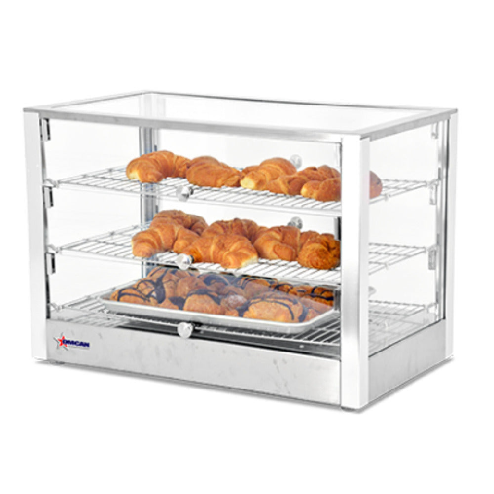 The Omcan 41873 (DW-CN-0115L) Food Warmer/Display Case is a versatile countertop solution designed for full or self-service applications, catering to the diverse needs of the food service industry. Measuring 27-5/8 inches in width, 15-3/4 inches in depth, and 19-1/2 inches in height, this display case offers ample space for showcasing a variety of food items. The unit operates within a temperature range of 86°F (30°C) to 194°F (90°C), supported by an adjustable temperature control system, ensuring optimal conditions for different food types. It is equipped with three fixed chrome-plated shelves, providing sturdy and reliable support for food display. The case features LED interior lighting, enhancing the visibility of the displayed items. With three hinged glass doors on both the front and rear, alongside a glass top and sides, this display case offers excellent accessibility and visibility from multiple angles. The interior and exterior are constructed from stainless steel, ensuring durability and ease of cleaning. Powered by 110v/60/1-ph, the unit requires 1300 watts and comes with a cord and NEMA 5-15P plug, shipped securely on a pallet. This food warmer/display case is ideal for bakeries, cafes, and delis seeking to present their products attractively and efficiently.