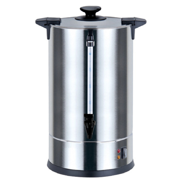 The Omcan 43463 (WB-CN-0049) Hot Water Boiler Electric 1.96 Gallon is a highly efficient and reliable solution for both commercial and domestic settings requiring a steady supply of hot water. This electric boiler boasts a capacity of 1.96 gallons, equivalent to 49 cups per hour, making it suitable for environments with moderate to high hot water demands. It consistently maintains the water temperature at an optimal 201°F, ensuring ready-to-use hot water for various applications. Crafted with a double-walled, brushed stainless steel construction, this hot water boiler not only ensures durability but also retains heat effectively. The non-drip chrome coated faucet adds convenience and prevents accidental spills, while the water gauge provides a clear indication of the water level for easy monitoring. For enhanced safety and stability, the unit is equipped with non-slip rubber feet. Operating at 110v/60/1-ph and using 1300 watts of power, the Omcan 43463 includes a cord with a NEMA 5-15P plug, and meets cETLus standards for electrical safety. This versatile hot water boiler is an ideal choice for cafes, offices, and catering services that require reliable hot water supply with minimal maintenance.