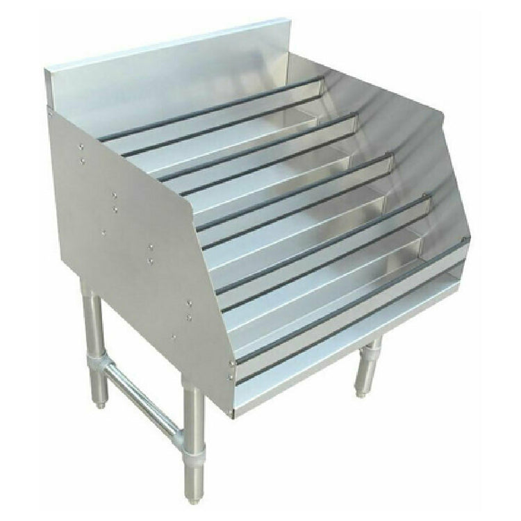 The Omcan 43479 (43479) Liquor Display Rack is a 5-tiered, free-standing unit meticulously crafted to meet diverse industry needs. With dimensions of 24"W x 25"D x 36"H, this display rack is designed for optimal space utilization, making it a practical choice for bars, restaurants, and retail environments looking to showcase their liquor selection efficiently. Its robust construction features an 18-gauge 304 stainless steel bottom, back, sides, hat channel, and steps, ensuring long-lasting durability and resistance to corrosion, a vital consideration in high-moisture environments. The display rack includes a 6" backsplash, adding a practical element to protect walls from spills and splashes. Additionally, it is reinforced with 16-gauge 304 stainless steel 2" high straps, enhancing its structural integrity. Galvanized legs with plastic bullet feet provide sturdy support and stability on various floor surfaces, ensuring that the rack remains level even when fully loaded. The NSF certification highlights its compliance with health standards, making it a reliable choice for establishments prioritizing safety and hygiene. The Omcan 43479 Liquor Display Rack is a blend of functionality and quality, tailored to meet the demands of different market segments within the hospitality and retail industries.