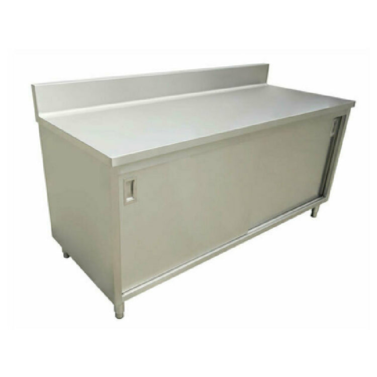 The Omcan 43480 (43480) Work Table Cabinet Base With Sliding Doors 48"W x 24"D x 36"H is a versatile and robust piece of equipment designed for professional kitchen environments. Its durable build features an 18/430 stainless steel hat channel, providing excellent support for the structure. The back, side, bottom, and intermediate shelves are constructed with the same 18/430 stainless steel, ensuring consistent durability throughout the cabinet. The top shelf is crafted from 16/430 stainless steel and includes a 6" backsplash, effectively preventing spills and maintaining cleanliness in the workspace. This work table is equipped with stainless steel legs featuring adjustable bullet feet, allowing for stabilization on uneven surfaces. Measuring 48 inches in width, 24 inches in depth, and 36 inches in height, the cabinet offers substantial storage capacity while maintaining a compact footprint suitable for various kitchen layouts. The sliding doors provide easy access to stored items without requiring additional clearance space, making this unit ideal for busy kitchens with limited room. Certified by NSF, the Omcan 43480 ensures compliance with public health and safety standards, meeting the rigorous demands of professional culinary settings. Shipped on a pallet, this work table is a practical and adaptable choice for diverse food service operations.