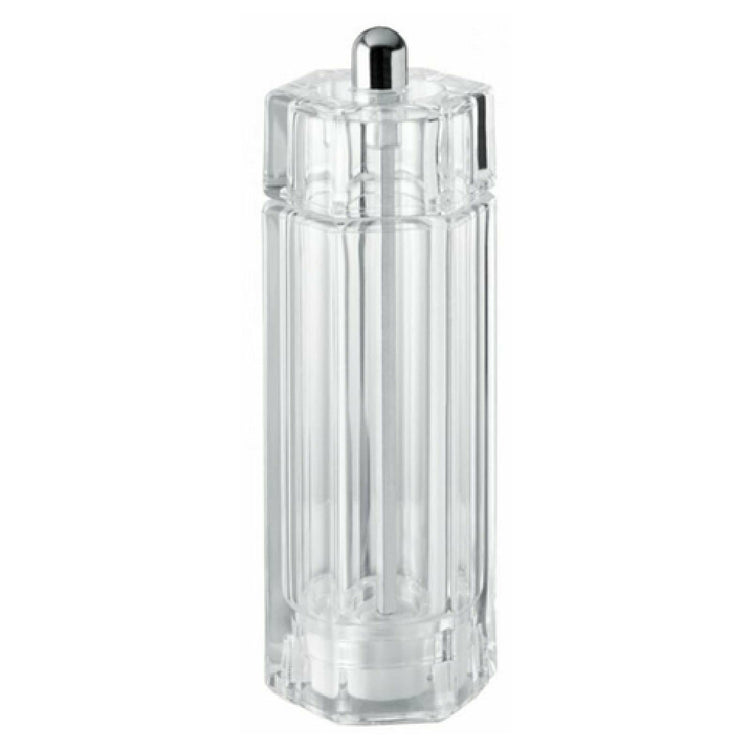 The Omcan 43704 (43704) TRE SPADE Tosca Series Salt Mill is a precision-engineered culinary tool, standing at 15cm (5") tall and expertly crafted from high-quality materials. At the heart of this salt mill lies a tempered steel conic mechanism, providing reliable and consistent grinding performance tailored for both amateur cooks and professional chefs alike. The steel shaft is fortified with an anti-rust coating, ensuring longevity and durability even in the most demanding of kitchen environments. Encased in an acrylic resin with a distinctive crystal shape, the salt mill not only performs impeccably but also adds a touch of elegance to any kitchen setting. This product is backed by a 20-year guarantee, highlighting its commitment to quality and customer satisfaction. Proudly made in Italy, the Omcan 43704 salt mill is an exemplary product within the culinary industry, perfectly suited for diverse market segments ranging from home kitchens to fine dining establishments, where precision and reliability are paramount.