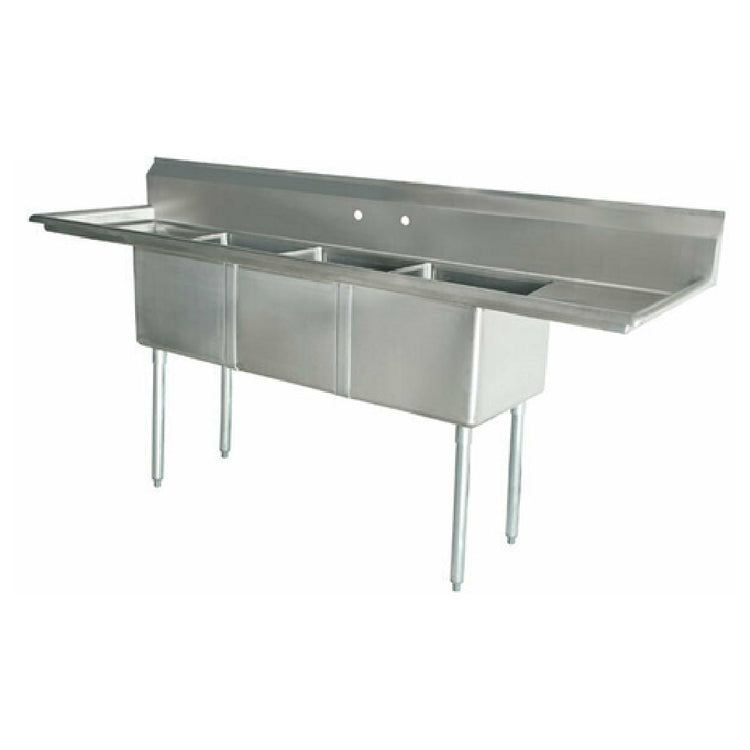 The Omcan 43763 Pot Sink is a highly functional solution designed for various professional kitchen environments, featuring three bowls each measuring 18 inches front to back, 18 inches wide, and 11 inches deep. This pot sink is meticulously crafted to facilitate efficient kitchen operations, with bowls that accommodate large pots and pans. It includes 8-inch center faucet holes, allowing for convenient water access and usage. The sink is outfitted with a 9-3/4-inch backsplash to help maintain cleanliness by preventing water and debris from splashing onto surrounding surfaces. Each bowl is equipped with center drains, ensuring optimal water flow and drainage. The design is complemented by left and right drainboards, providing additional workspace for drying and organizing kitchenware. Constructed from 18-gauge, 304 stainless steel, the sink offers a durable and corrosion-resistant surface suitable for the rigorous demands of commercial settings. Galvanized legs with adjustable bullet feet provide stability and support, while allowing for height customization to fit specific needs. Certified by NSF and CSA, the Omcan 43763 Pot Sink meets strict public health and safety standards, making it a reliable choice for establishments prioritizing hygiene and efficiency in their operations.