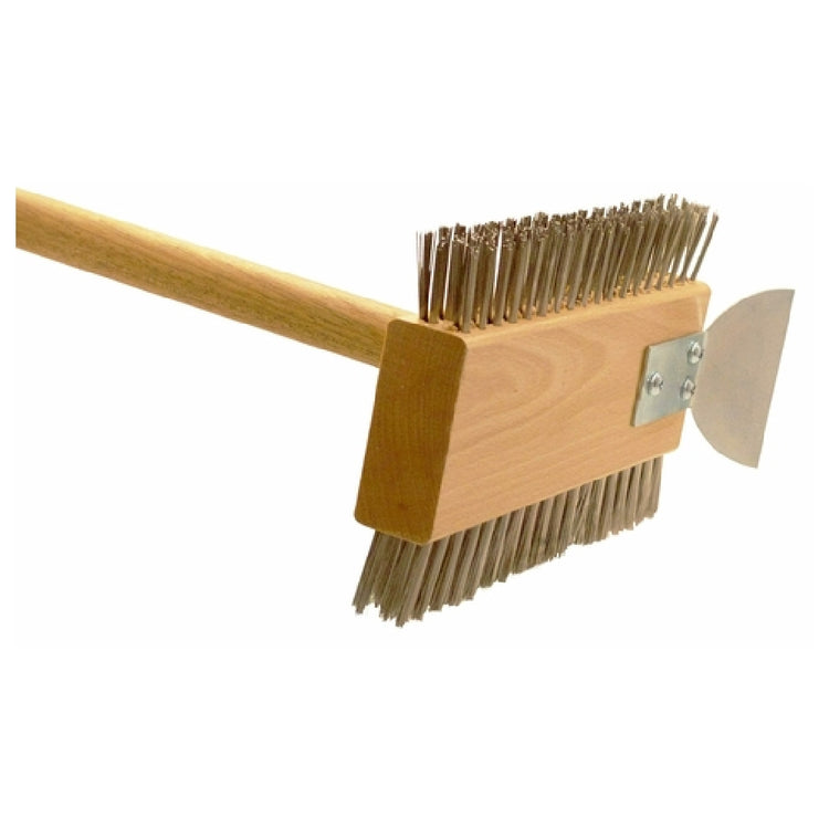 The Omcan 44218 (44218) Classic Double-Sided Broiler Brush is a highly efficient cleaning tool tailored to meet the rigorous demands of the food service industry. Featuring a double-sided design, this broiler brush is equipped with round stainless steel wire bristles that provide robust cleaning performance, ensuring grime and residue are effectively removed. Its 30-inch long handle offers extended reach, facilitating ease of use when cleaning large broiler surfaces. The inclusion of a vertical scraper enhances its cleaning versatility, allowing users to tackle stubborn burnt-on food debris with precision. This tool is indispensable for restaurant kitchens and catering services, where maintaining spotless equipment is paramount to ensuring food safety and quality. Crafted from durable materials, the Omcan 44218 is designed to withstand frequent use in high-volume environments, providing long-lasting reliability. Its ergonomic design not only promotes efficient cleaning but also supports user comfort during extended cleaning tasks. This broiler brush stands out as a practical solution for culinary professionals seeking to maintain high standards of cleanliness in their cooking operations. With its comprehensive range of features, the Omcan 44218 delivers exceptional value across various market segments, including restaurants, hotels, and food service facilities.