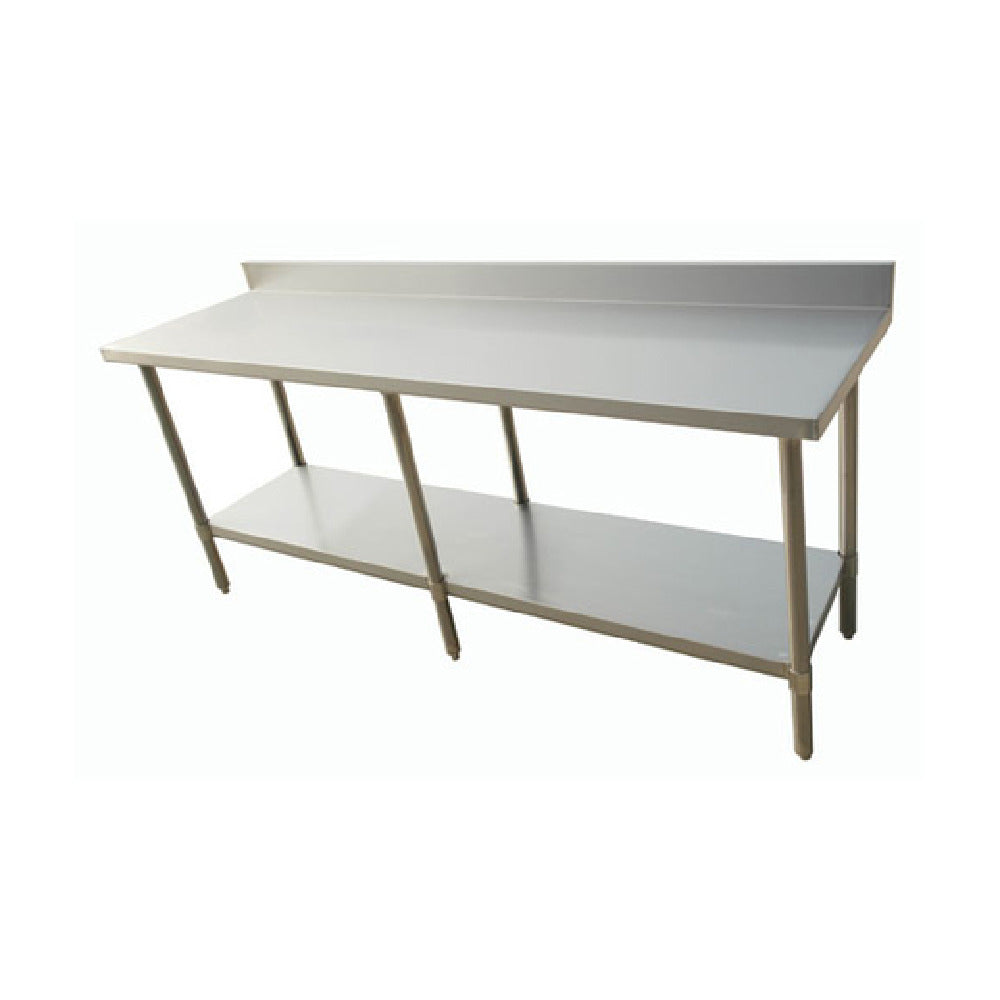 The Omcan 44349 (44349) Work Table is a versatile and robust addition to any commercial kitchen or food processing environment, measuring 96 inches wide, 30 inches deep, and 34 inches high. Crafted with a 20 gauge 430 stainless steel flat top, this work table is designed for durability and easy maintenance. The table includes a 4-inch backsplash to help maintain cleanliness and prevent spills from reaching the floor. For added structural integrity, the table features a hat channel underneath the flat top. The stainless steel undershelf provides additional storage space, making it practical for busy kitchen environments. Supported by sturdy stainless steel legs, the table is equipped with bullet feet to ensure stability on various surfaces. It is NSF certified, ensuring compliance with public health and safety standards, making it suitable for a wide range of applications, from bustling restaurants to industrial food preparation facilities. This work table combines durability with functionality, meeting the rigorous demands of different market segments within the food service industry. Its thoughtful design and sturdy construction make it an invaluable work surface for any foodservice operation looking to optimize their workspace.