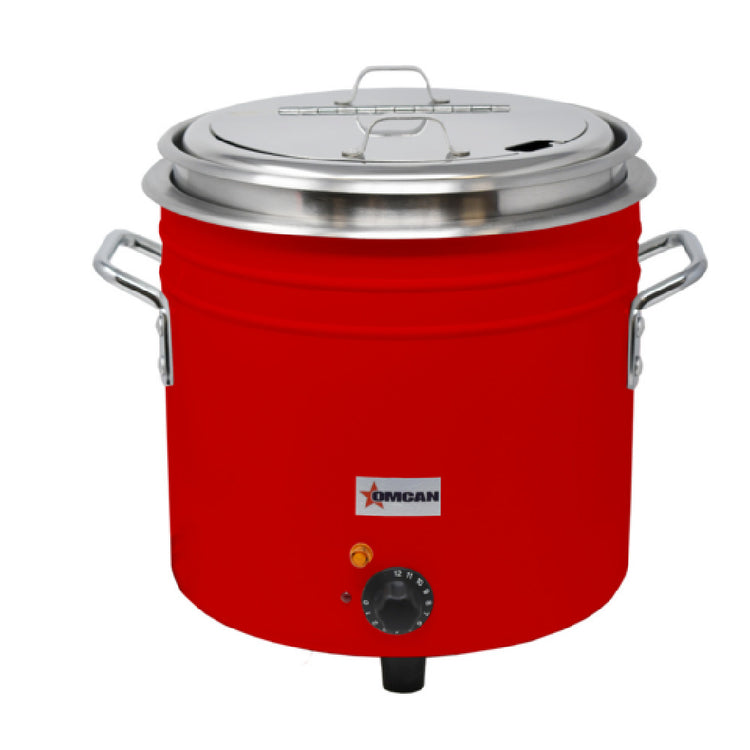 The Omcan 44426 (FW-TW-5000-R) Retro Stock Pot Kettle Electric 11 Qt. Capacity is a versatile kitchen appliance designed for efficiency and style. With an 11-quart capacity, it is suitable for various culinary applications, from professional kitchens to home use. The kettle operates on an electric input of 1400 watts and a 120v/60/1-ph power specification, drawing 12 amps and utilizing a NEMA 5-15P cord for connectivity. Its temperature range of 86°C to 212°C offers precise control over cooking and heating processes, which can be easily adjusted using the manual dial control. The outer surface of the kettle features a red coated ceramic exterior, adding a touch of retro elegance to any kitchen décor. To ensure stability and prevent slipping during operation, it is equipped with non-skid feet. The combination of a sizable capacity, broad temperature range, and classic design makes the Omcan 44426 Retro Stock Pot Kettle an excellent choice for different segments within the food industry, including restaurants, catering services, and home kitchens. Its reliable performance and aesthetic appeal provide both functionality and style, highlighting its unique value proposition in the market.